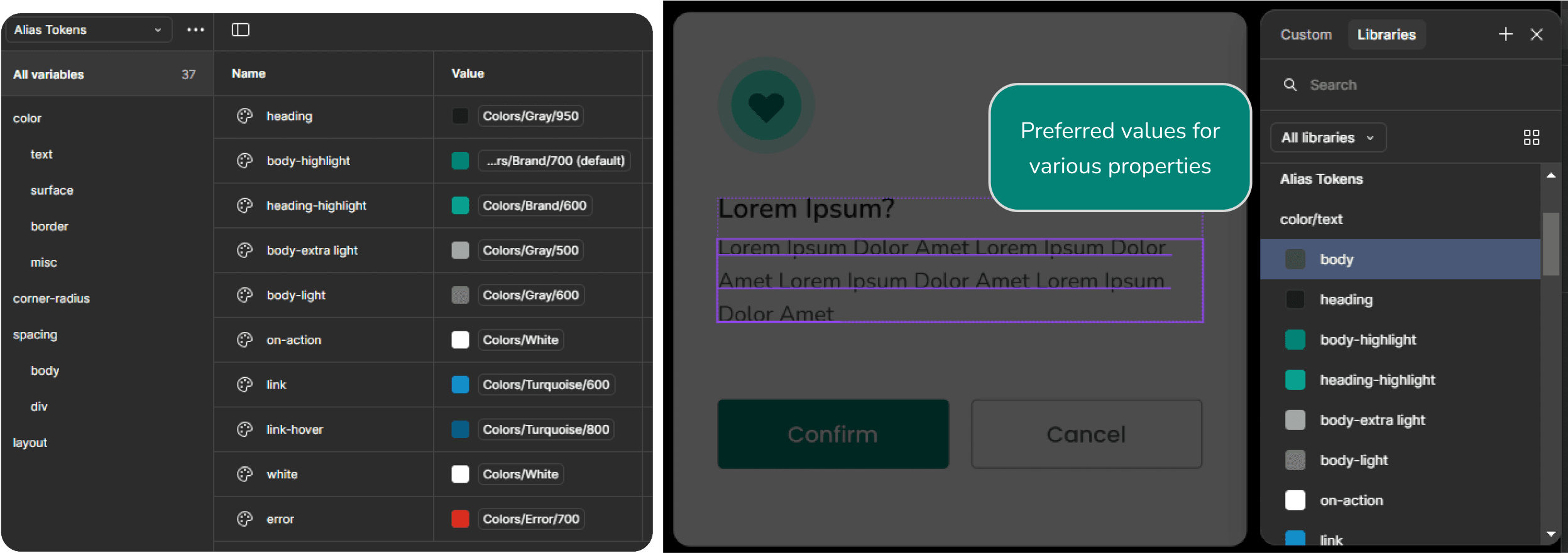 These values are derived from global tokens, allowing them to automatically adapt to changes in the global variables. They are presented as Figma’s preferred property values, enabling quicker and more consistent application across components.