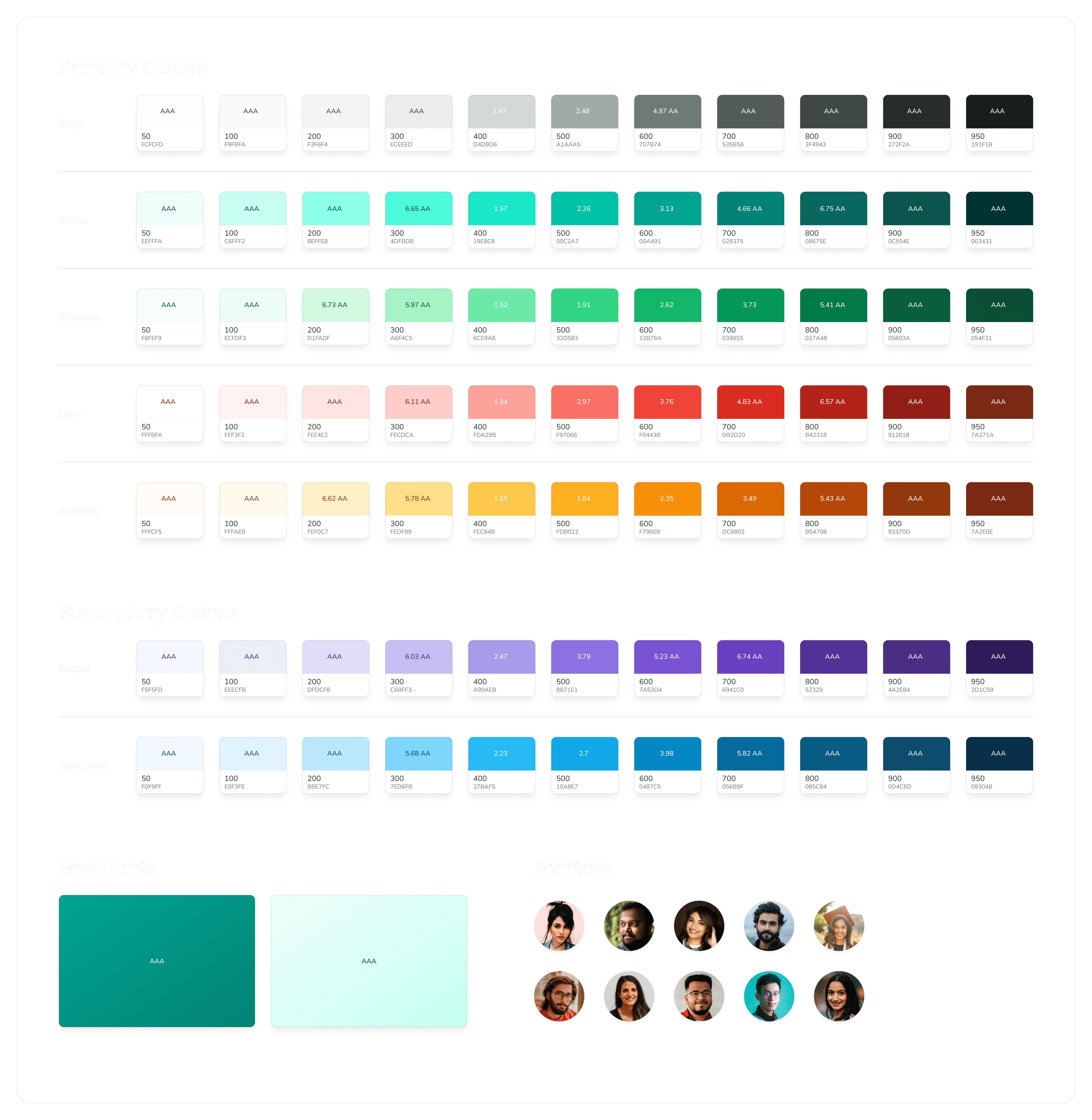 The primary brand color was sea green (700, #028375). I defined standard success, error, and warning colors to harmonize with the brand palette and infused a hint of the brand color into the grays for visual consistency. I conducted accessibility checks for all colors, including their light and dark variants, and specified appropriate shades for use on various backgrounds.